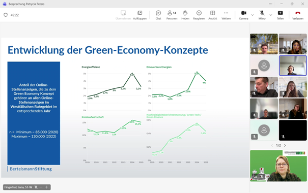Beim heutigen digitalen Workshop zum Jobmonitor der Bertelsmann Stiftung im Themenfeld Green Economy der Regionalagentur Westfälisches Ruhrgebiet wurde deutlich, wie stark politische Rahmenbedingungen die Entwicklung von Stellenanzeigen prägen. Der erwartete Regierungswechsel 2025, das neue Wärmepumpengesetz, die EEG‑Reform und weitere gesetzliche Anpassungen beeinflussen bereits spürbar die Nachfrage nach Fachkräften in grünen Branchen. Die Daten zeigen zudem einen deutlichen Rückgang im Vertrauen vieler Unternehmen der Region, sich in diesem Aufgabenfeld aktiv zu engagieren. Gleichzeitig wurde diskutiert, dass nicht alle Betriebe ihre Stellenanzeigen veröffentlichen – was die tatsächliche Marktdynamik zusätzlich verzerrt.